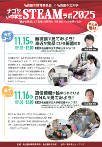 2025.10.9 11月15日(土)探究学習プログラム「ナゴヤ小中学生STEAMラボ2025」を開催いたします 2025年11月15日(土)「ナゴヤ小中学生STEAMラボ2025」を開催いたします。 食品と細菌の関係について、身近にある発酵食品などを使用し、実際に顕微鏡で観察します。 ご興味のある方は、ぜひご応募ください。 「ナゴヤ小中学生STEAMラボ2025」